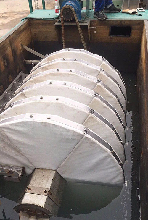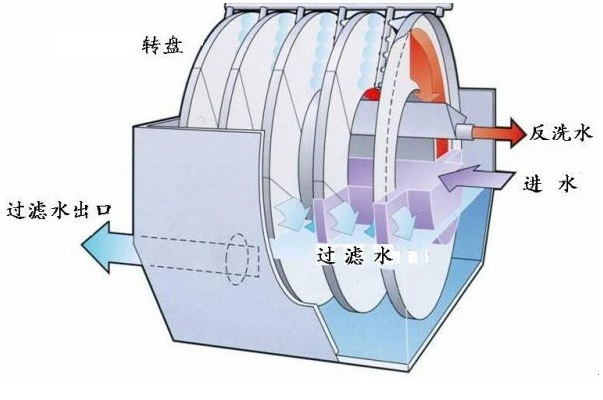 轉盤過濾器簡介:轉盤式過濾器由多個濾盤垂直安裝于同一中央轉軸上組成,過濾介質為濾布。